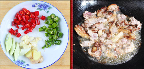 5、辣椒一定在热油里过一下,可以去掉生辣的味道,不然直接放进鸭子里会有一些生辣的味道混杂其中,影响口味。