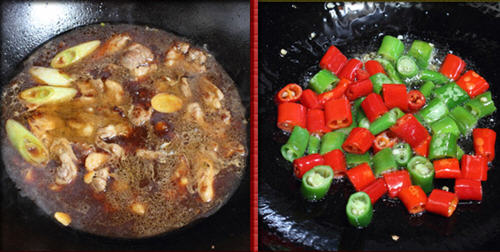 6、辣椒要在最后汁快收干的时候放,提前放辣椒容易烂掉,影响美观和口感。