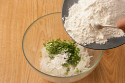 4、倒掉腌渍出的水分后,将香菜末、小葱末、面粉、盐、五香粉倒入盛白萝卜丝的大碗中搅拌均匀,捏成一个个小丸子球。