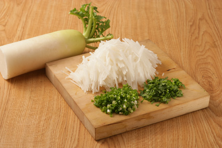 2、白萝卜去皮擦细丝,香菜切末、小葱切末。