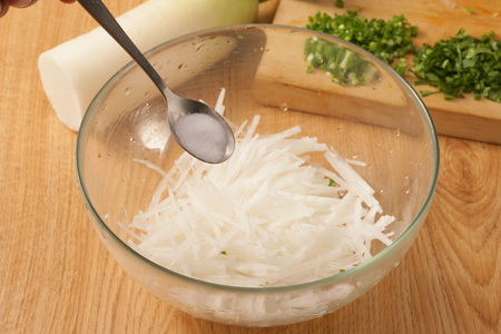 3、白萝卜丝放入大碗中,撒1茶匙盐抓匀,腌20分钟后轻攥去水分。