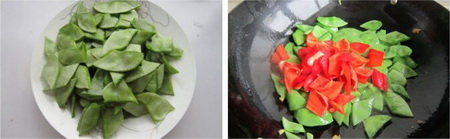 2、把扁豆洗净去掉头尾,切斜片,红辣椒洗净切斜片,姜洗净切末