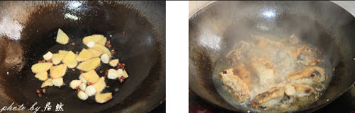 5、炒锅放少许油,爆香姜片、蒜片和花椒。