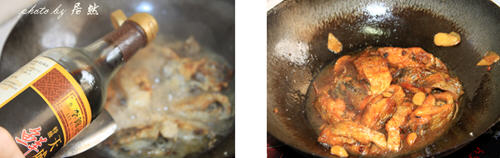 6、放入煎好的带鱼,轻轻翻动鱼块吸收香味,沿着锅边放入剩下的米酒,爆出香味后倒入一碗温水烧开。