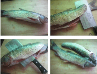 2、将鱼身从尾部入刀,剖劈成雌、雄两片,斩去鱼牙,在鱼的雄片(带尾巴)上,划斜刀。
