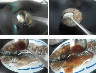2、锅内原汤汁中,加入白糖、黑醋和湿淀粉,调匀的芡汁,用手勺推搅成浓汁,浇遍鱼的全身即成,撒上葱姜末。浇汁要薄而浓,用深色醋比较好。