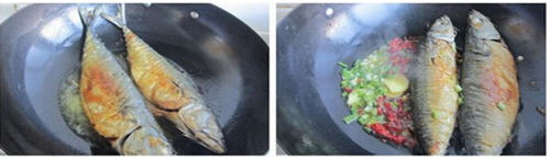 2、热锅凉油,油热8成下鲅鱼,煎到两面金黄色,把鲅鱼拨在一边