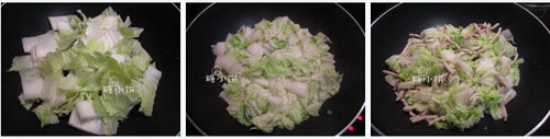4.白菜洗净后切成小片,菜叶和菜杆分开放置(炒肉丝的余油留在锅内烧热,加入白菜杆翻炒至有些失水变软)