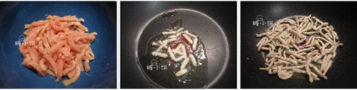3.放入腌好的肉丝翻炒至变色后盛出备用
