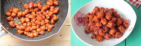 12、最后加入炸好的猪肉炒拌均匀至酱汁均匀的裹在猪肉快上即可