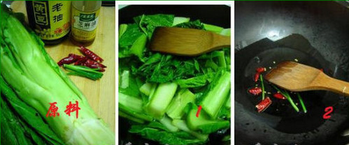 1、将天菜心切段,适当保留根部,我觉得根部比菜叶好吃,放入开水中焯一下,捞起。