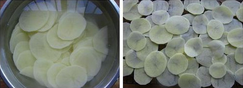 3.将切好的土豆片泡在水中洗掉淀粉。