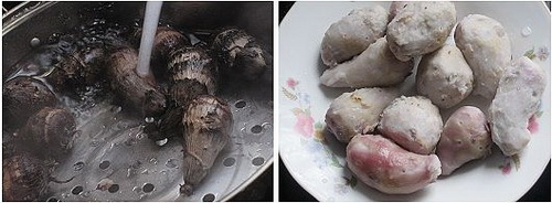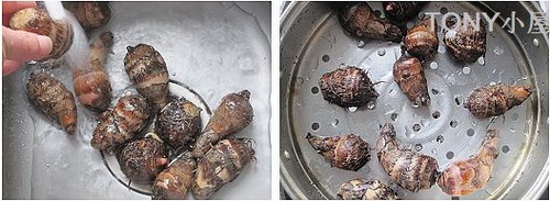 1.小芋头冲洗干净后放入锅里冷水蒸12分钟;