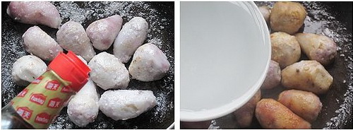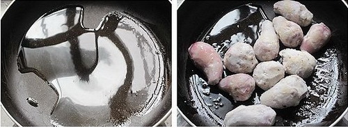 3.热锅冷油,加入去皮的小芋头,煎到有点金黄色;