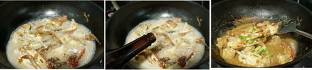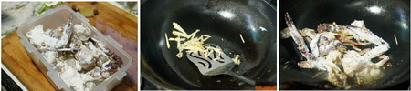 6.再放入略多点的油,把蟹块入锅煎到微黄