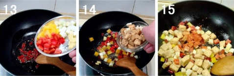 13-15、炒锅中注入少许底油,用凉油放入花椒和辣椒丁小火煸炒,这样可防止干辣椒煸焦,待把干辣椒煸至浅琥珀色后倒入彩椒和葱姜丁炒匀,然后倒入焯过水的豆腐丁和冬笋丁炒匀,炒匀后撒入少许辣椒面炒匀,最后烹入勾兑好的碗汁用旺火翻炒均匀。