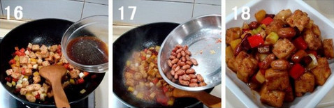16-18、待烹入锅中的碗汁糊化后,倒入油炸花生米炒匀便可出锅码盘,此菜制作完成。