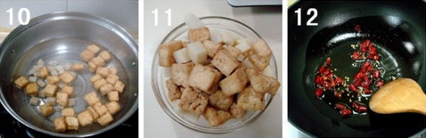 10-12、把事先炸好的豆腐丁和冬笋丁焯水,以此去除冬笋的草酸和豆腐上的油脂,炸豆腐焯水后也便于在炒的时候入味,口感们也好。