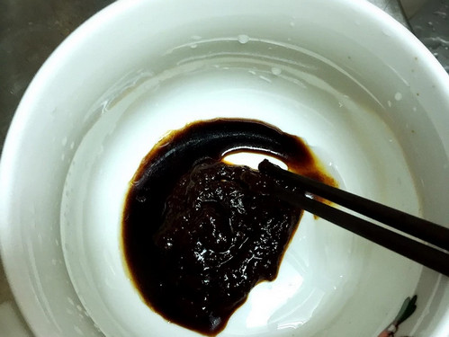 2、煮面的时间不要浪费,先把酱汁全部挤到碗里面(酱汁全部挤光光不要浪费喔!! 这酱汁好吃到连我这么怕咸怕辣的人都可以吃到一滴不剩呢)