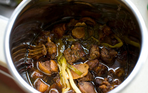 7、将锅中所有东西移至高压锅中压15分钟,使鸭肉更容易软烂。