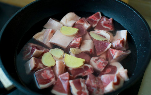 2、锅中放凉水,水量要可以没过鸭肉。水中放4-5片姜片,2汤匙料酒,将鸭块放入凉水锅中。开大火加热至沸腾,用勺子撇去表面浮沫,继续大火煮5分钟后关火,将鸭肉捞出,将里面姜片拣出,沥水备用