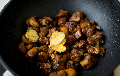 4、将鸭块、剩余的姜片放入熬好的糖色中,转中火翻炒,使糖色均匀裹在鸭块表面。