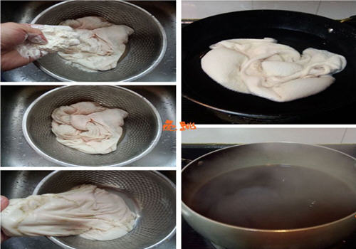 3.翻一面也这样清洗,然后把里面的一些脏膜撕去,直到没有异味。