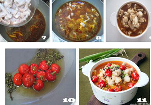 8、另起锅,倒入少量食用油,放入泡椒和鲜花椒,炸出香味后浇在牛蛙上即可。