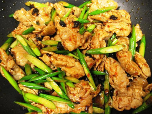 2、青蒜下锅不宜久炒,要快速起锅,方能保持翠绿色。如无青蒜,可用大葱代替
