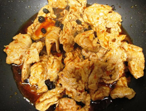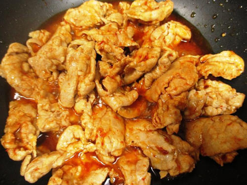 3、加入豆瓣酱,炒出红油,裹上肉片。