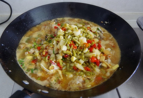 5、炸鱼的油倒出,留一点在锅里,把炸好的鱼放回锅里,将步骤3调好的调料汁均匀的淋上去,片刻过后,将切碎的泡菜倒入。