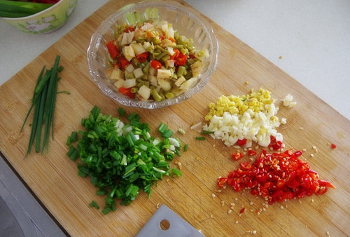 3、将所有材料切碎备用,准备一个碗,将辅料里面的调料全部加入碗里,然后加一些水调匀。