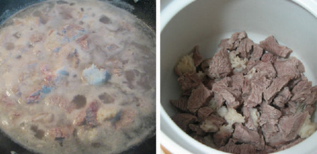 4、用筷子将焯水的肉块在锅中涮干净,然后夹出入炖锅中。