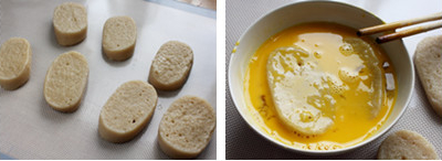 4.鸡蛋打散,将切片的黄糖糍粑蘸裹上蛋液。