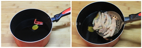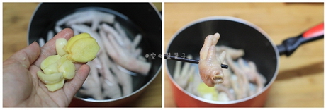 2、锅中放适量水加姜片,将凤爪放进去,水开后转中火煮15分钟左右,筷子能轻轻捅穿的程度。