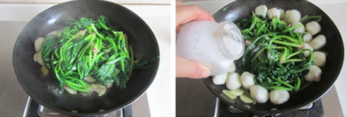 3、喜欢汤汁时可以在炒菠菜鱼丸加入点高汤, 自己随意。