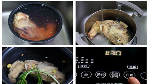 3.将鸡架放入电饭锅内胆中,加入水、姜和葱。