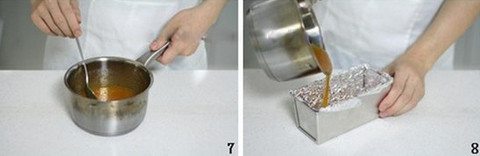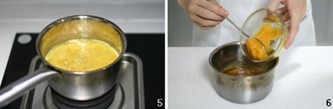6、离火的糖浆冷却片刻,使温度稍稍降低一点,然后把步骤2的杏果泥鱼胶粉混合物倒入。