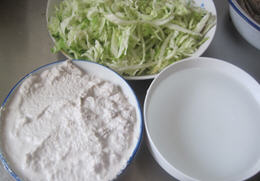 3、取花生浆适量,大白菜洗净切成丝,葱切碎,蒜切蒜茸。