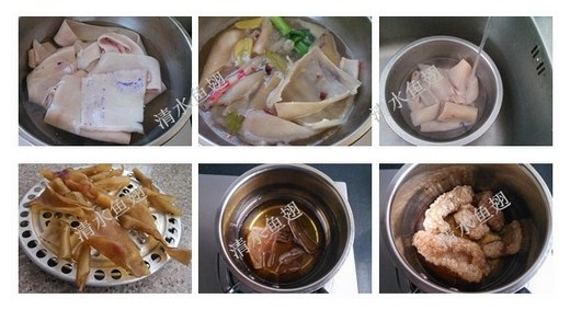 2.将肉皮放在篦子晾干,这季节上晾上1-2天就会很干了,晾干的肉皮用水冲去表面脏土,擦干水分备用。锅中加油,油温5-6成热时分几次下入肉皮炸制,当肉皮被炸得通体都起大泡时就可以捞出了。