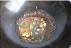 7.利用过重的余油,把葱姜蒜倒进去爆香,然后倒入料汁用大火烧开;