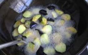 5.锅中油烧热后把茄子放进去炸,炸至变软后捞出;