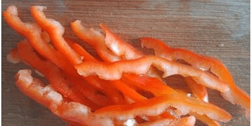 8.锅中重新加适量油,烧热后把苦瓜和红椒丝倒进去翻炒,加入适量食盐再次翻炒;