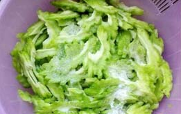 4.苦瓜切成薄片,加入适量食盐搅拌均匀腌制一会儿;