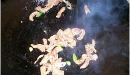 4.加入猪肉一起翻炒,加入少许面酱给肉上色;