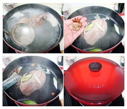 配料:葱段、姜片、草果、肉蔻、花椒、大料