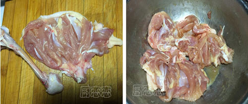 3、剥下来的鸡肉切开成片,然后在肉比较厚的地方割几刀,以便入味