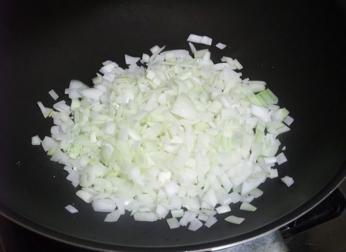 2、炒锅内加入一匙油先拌炒洋葱。