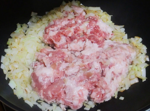 3、洋葱炒至金黄色,在加入猪绞肉继续拌炒。