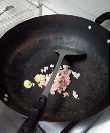 4、刀豆将熟时倒入肉末和橄榄菜,大火翻炒一分钟左右。